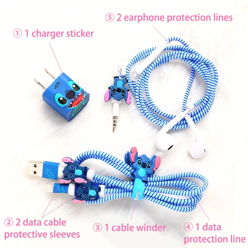 Disney Stitch Charger Cables Protector Winder Sticker Kawaii Anime Figure Data Line Head Headphone Cable Usb Storage Iphone Gift